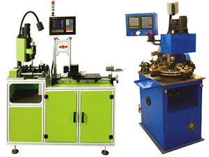 The CNC speaker coil fly winding machine is a CNC machine used for winding self-supporting speaker voice coils using wires that have been coated in a thermo-plastic adhesive. The wire is heated by a hot air supply as it is wound onto the coil, and each turn is bound together using the adhesive. Finished coils are removed from the tool and automatically ejected from the machine onto a rotating unloading tool.